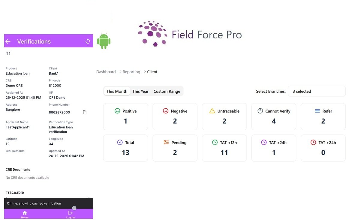 The platform integrates GPS tracking and an in-app camera that embeds latitude and longitude stamps at the moment of capture, guaranteeing location authenticity. Built for real-world field conditions, Field Force Pro supports offline operations with controlled, secure sync once connectivity is restored. Its intelligent TAT bucket system with automated notifications helps organizations enforce SLAs, reduce turnaround times, and maintain full visibility—making Field Force Pro a crucial solution in an ecosystem where truly compliant field verification tools are rare..